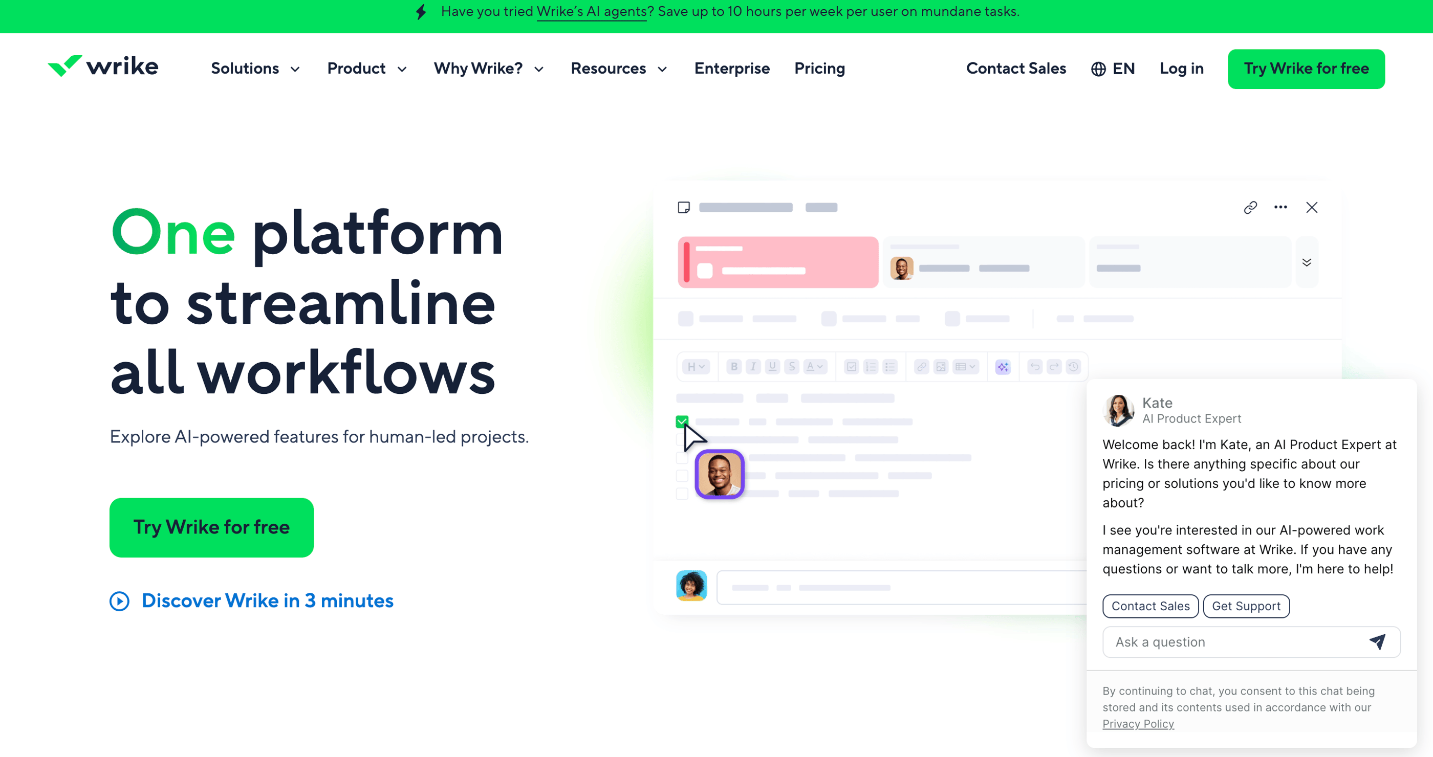 Wrike’s paid plans start at $10 (Team Plan) and $25 (Business Plan) and custom plans both packed with powerful tools to keep your projects organized, on track, and actually stress-free. Check out pricing here.